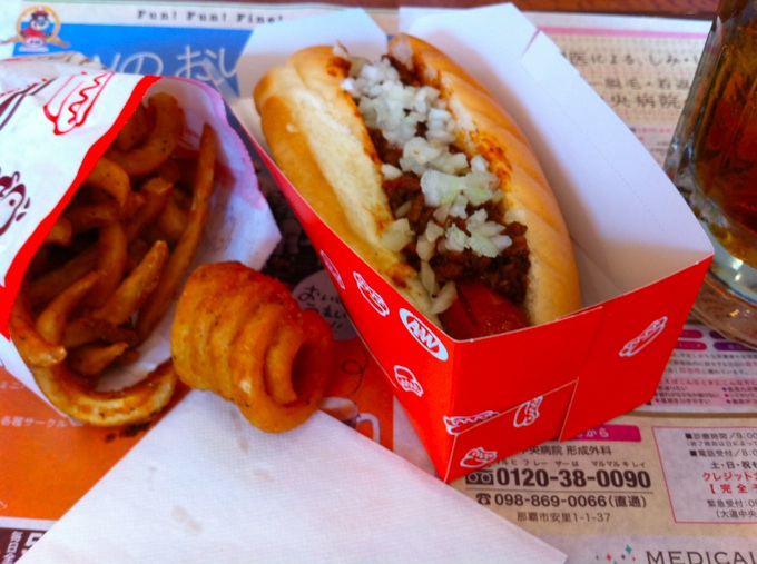 4月20日金曜日の午後3時頃、那覇到着。そのままレンタカー借りて、今宵の演奏場所、本島北部の本部町、居酒屋洒楽を目指します。が、お腹が空いたのでちょっと寄り道。沖縄のファーストフードチェーンといえばA&W(エーアンドダブリュー)。通称「エンダー」です。「マクド」みたいなもんですね。コニー・ドッグとカーリーポテト。おかわり自由のルートビアはスルーの方向で(・∀・)