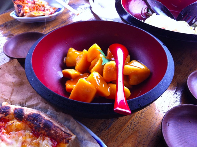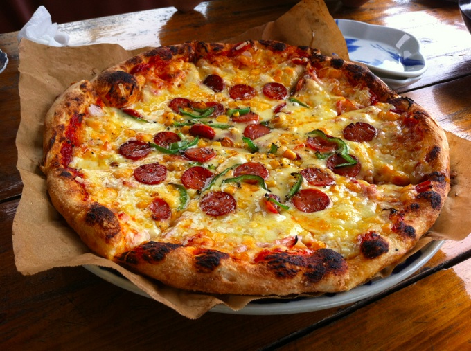 翌日は午前中に起床。本部に来たら、たとえ二日酔いであろうともここは絶対に外せないピザ屋さん、花人逢へ。お昼前に行かないと、12時過ぎると見る見る満席になってしまう人気のお店なのであります。食べるとその人気の理由がわかります。うんまいの。
