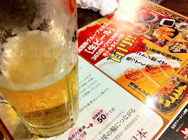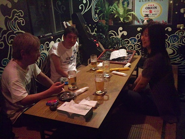 サンセットビーチにある温泉で長野チームと共にのんびりしたあと、夜は宮崎マンドロリン氏&藍田くんの師弟コンビと那覇で合流。安里の「生活の柄」というお店へ。そしてその後またまた昨夜とおなじ100円ビールの「ぼんじりや」へ。どれだけ気に入っとんねん。