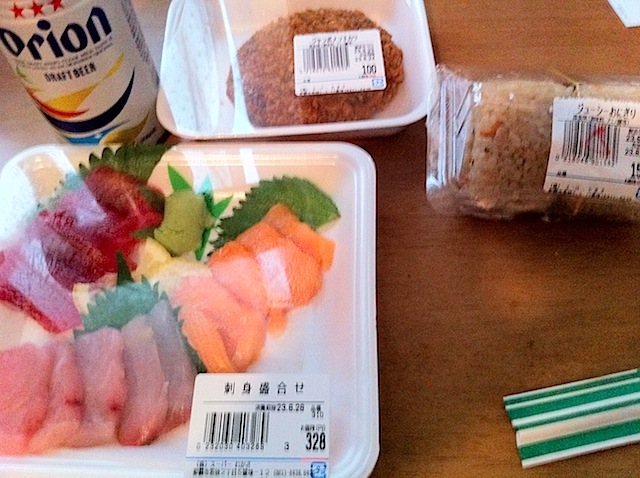 洗濯物取り込んでホテル近くの地元のスーパーで刺身とジューシーおにぎりとメンチカツ買って部屋で一人飲み。