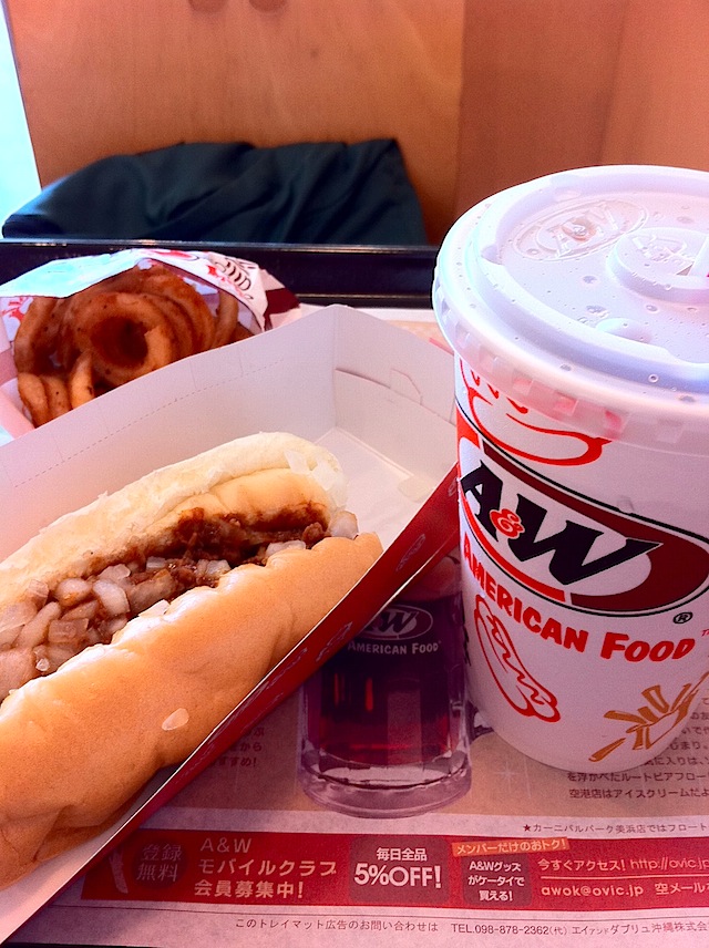 那覇空港でエンダーのコニードッグを食べながら、沖縄との別れを惜しむ。