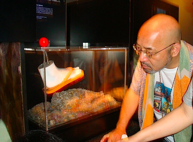 オニダルマオコゼの毒針が飛び出す模型を食い入るように眺めるオニダルマ、もとい大村はん。