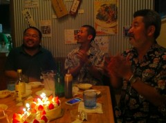 そして店内の照明が急に暗くなり、何事か停電かと思ったら、ケーキが出てきたよ。なんと山さん、日付変わった4月23日がお誕生日だそうで!!ハピバスデー!!!めでたくも49歳になられたそうです。「始終クサイ」とのことです。いやいや、おめでとうございます!!!