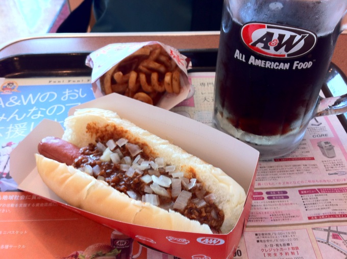 時間持て余して裏通りを1時間以上ぶらぶらして、那覇空港へ。空港のA&Wで沖縄ツアー締めのコニードッグ。そしてひさびさにルートビアを。う〜ん、サロンパス。やっぱ無理です。全部飲んだけどね。帰り際、返却テーブルの上見たら、ルートビア飲み残したジョッキが4つほどありました。気持ちはわかる。でも残したらあかん。